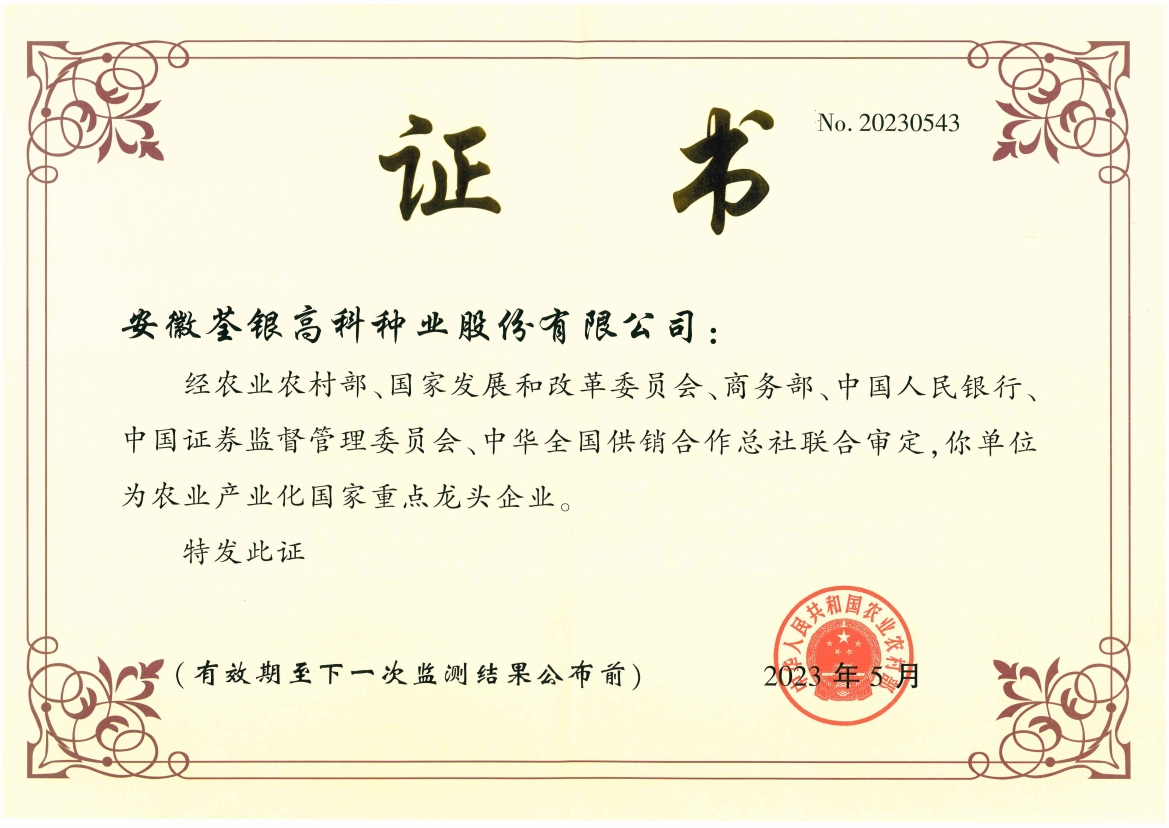 安徽荃銀高科種業股份有限公司是一家“以種業為核心、農業服務為延伸、探索和創新農業多元化發展”的現代高科技種業上市公司,證券代碼:300087。公司注冊資金9.47億元,系“中國種業領軍企業、農業產業化國家重點龍頭企業、國家高新技術企業、農業部首批農作物種子育繁推一體化企業、中國種業信用明星企業"。在國內控股子公司20多家,在國外設立分支機構4家,良種銷售至全國20多個省(市、區),出口覆蓋20多個國家與地區,種業綜合實力、雜交水稻研發、推廣及海外業務規模均居全國種子企業前2位。